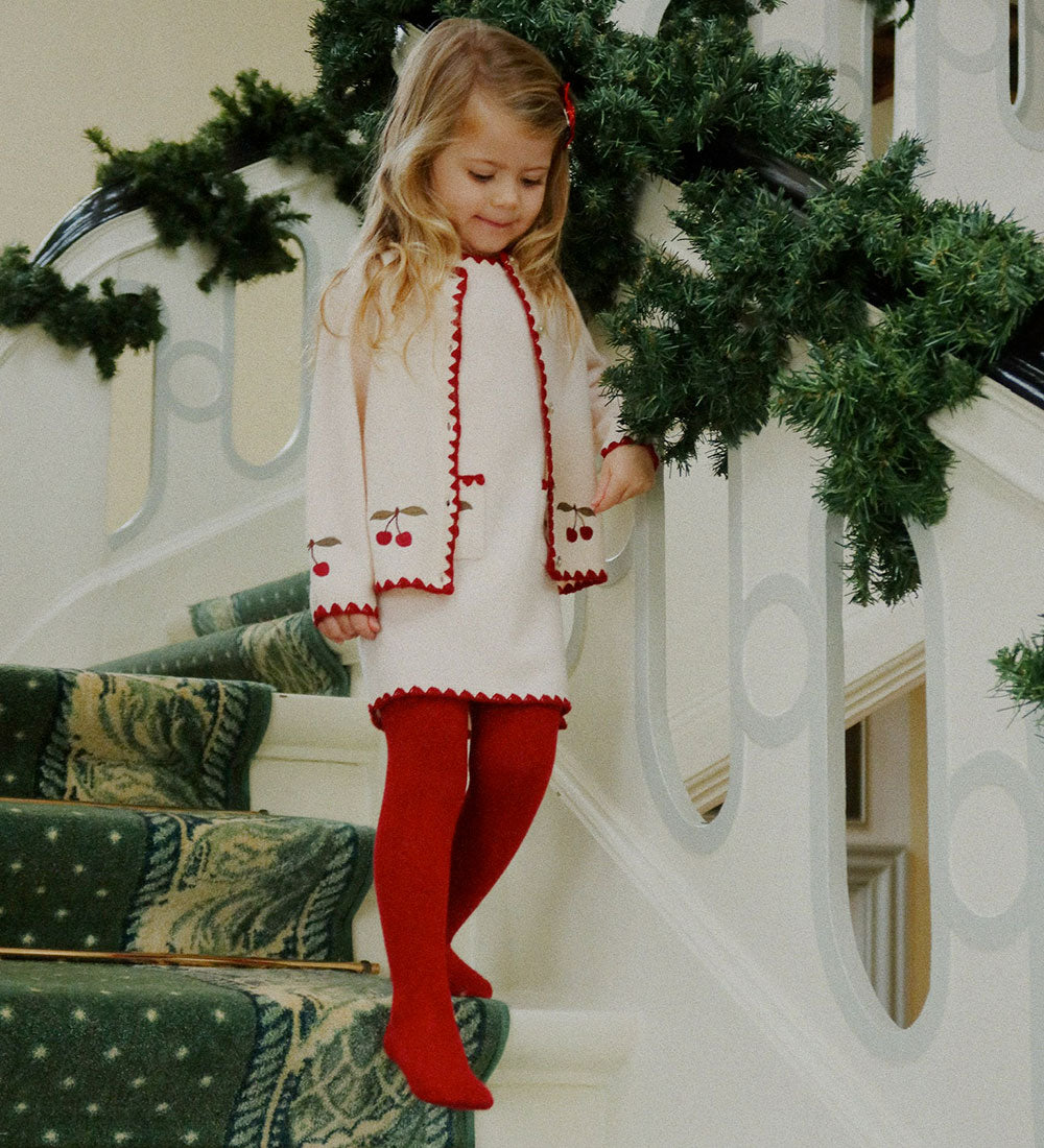 Skøn Konges Sløjd cardigan i lys Rosa med ynudge kirsebærbroderier langs kanten fortil og yderst på ærmerne. Cardiganen har lange ærmer og en flot zigzag-kant i rød langs knaplukningen og nederst ved ærmerne. Konges Sløjd cardiganen lukkes med knapper, og den er lavet i en blød, strikket uldkvalitet.