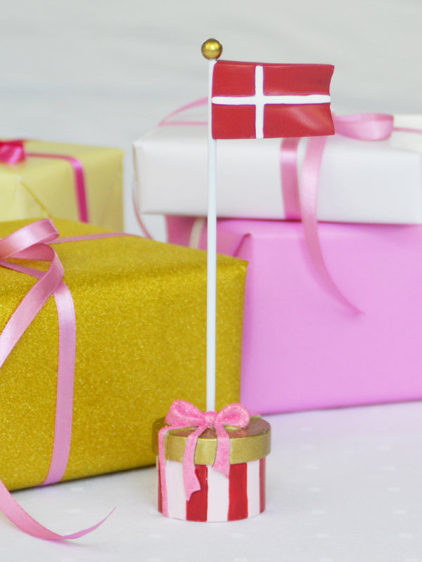 Dette charmerende bordflag med en stor pakke i pink nuancer er den perfekte dekoration til fødselsdagsbordet. Det er også en ideel gave til dåb eller barselsgave, der vil bringe glæde og mindeværdige stunder til enhver fejring.