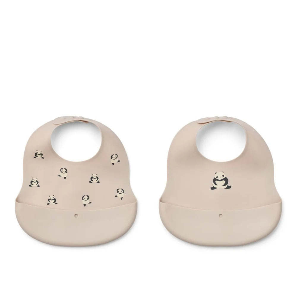 En praktisk hagesmæk i silikone fra Liewood i farven Panda/Sandy med et print af søde pandaer. Hagesmækken lukkes i nakken og justeres i størrelsen.