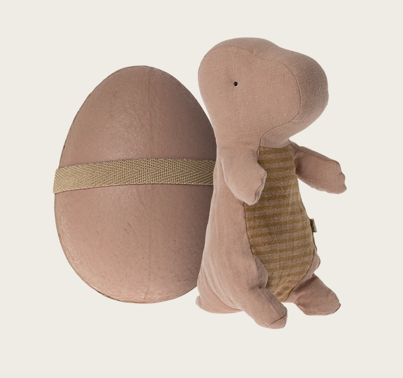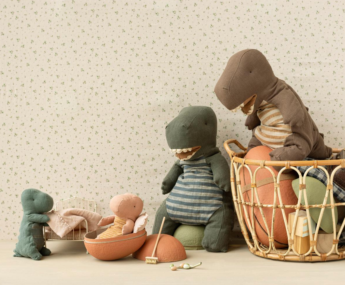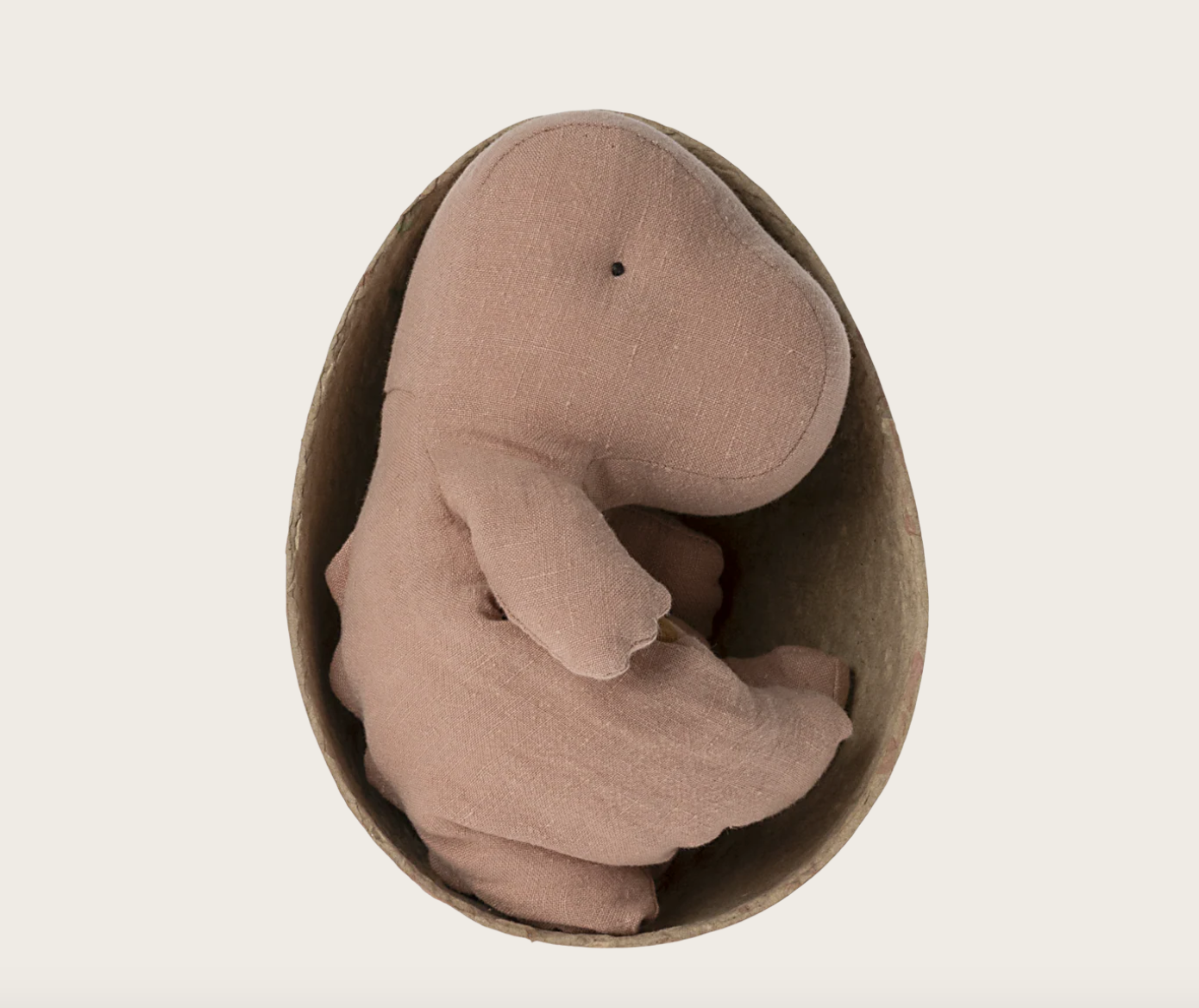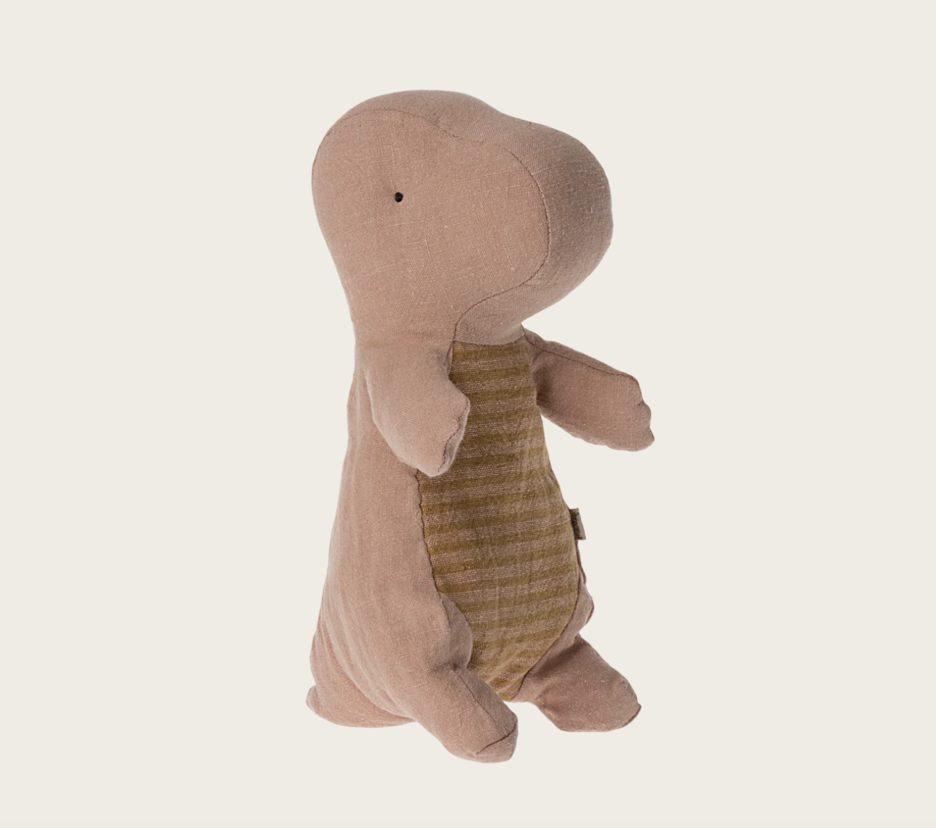 Dinosauren er lavet i hør med fyld af polyester og kan vaskes ved 30 grader.