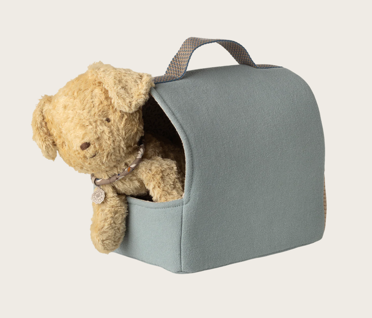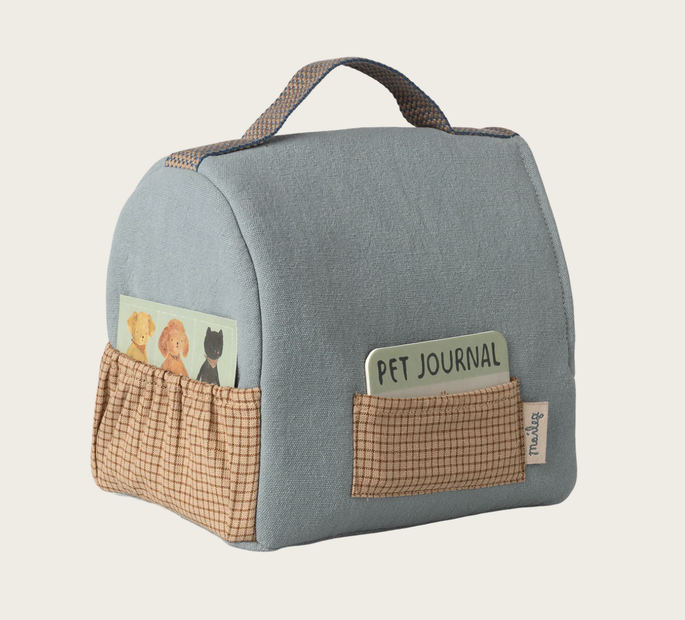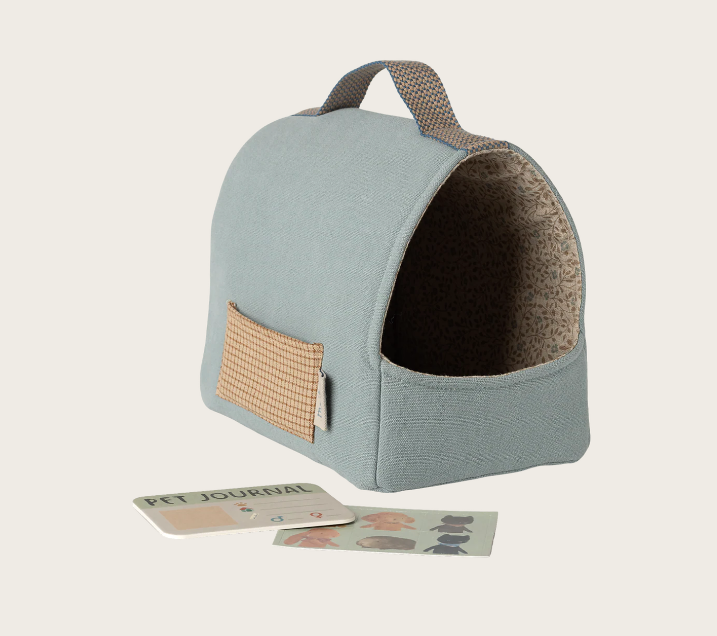 Denne skønne og bløde taske med håndtag er perfekt til de fine Maileg plyskillinger eller nye små hunde, eller andre små bamser selvfølgelig, der passer i størrelsen. Tasken er i en blå farve og har et super fint ternet mønster på lommerne. Her medfølger en kæledyrsjournal, så der kan holdes styr på billede, navn og fødselsdag. En dekorativ og praktisk tilføjelse til ethvert børneværelse.