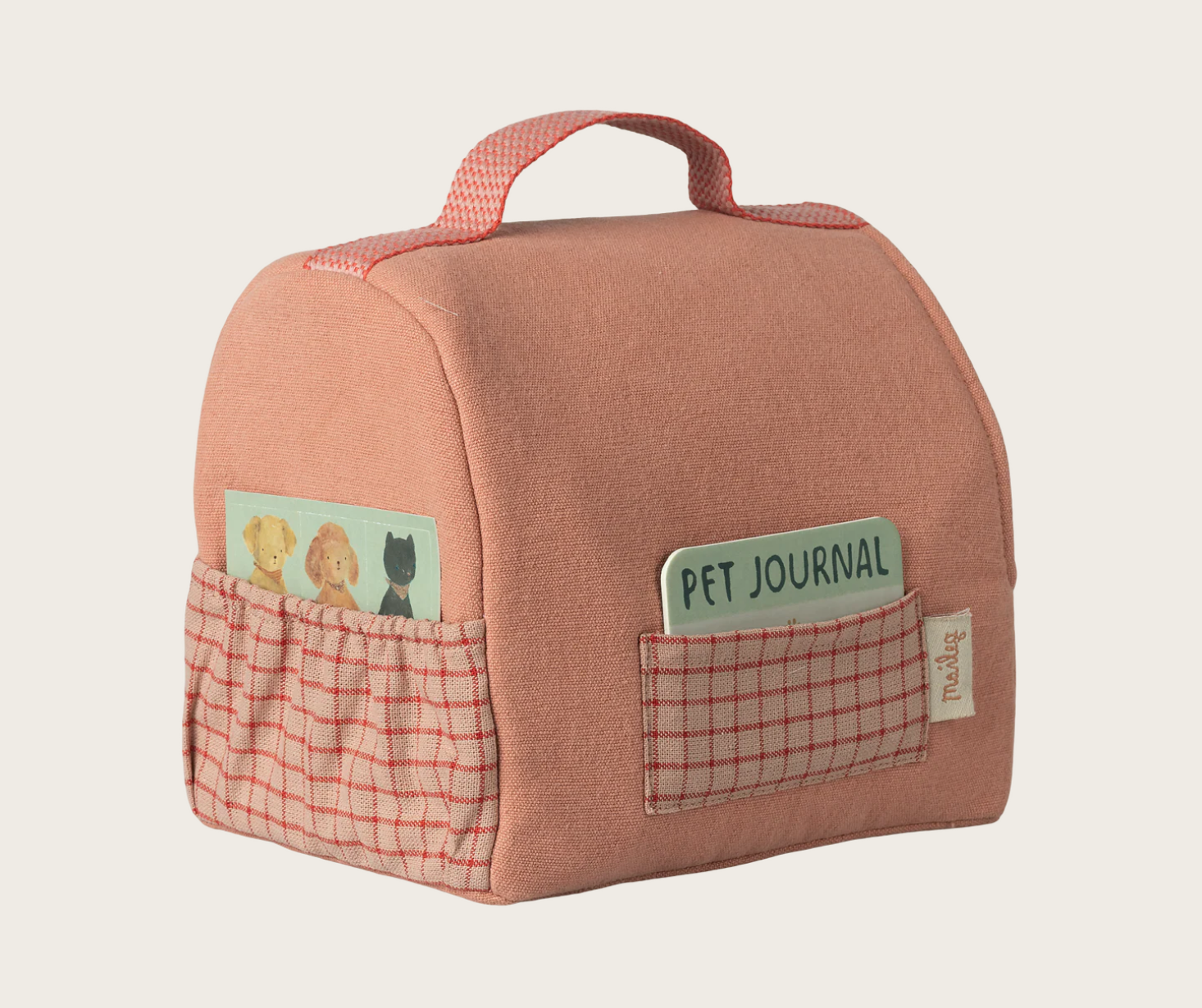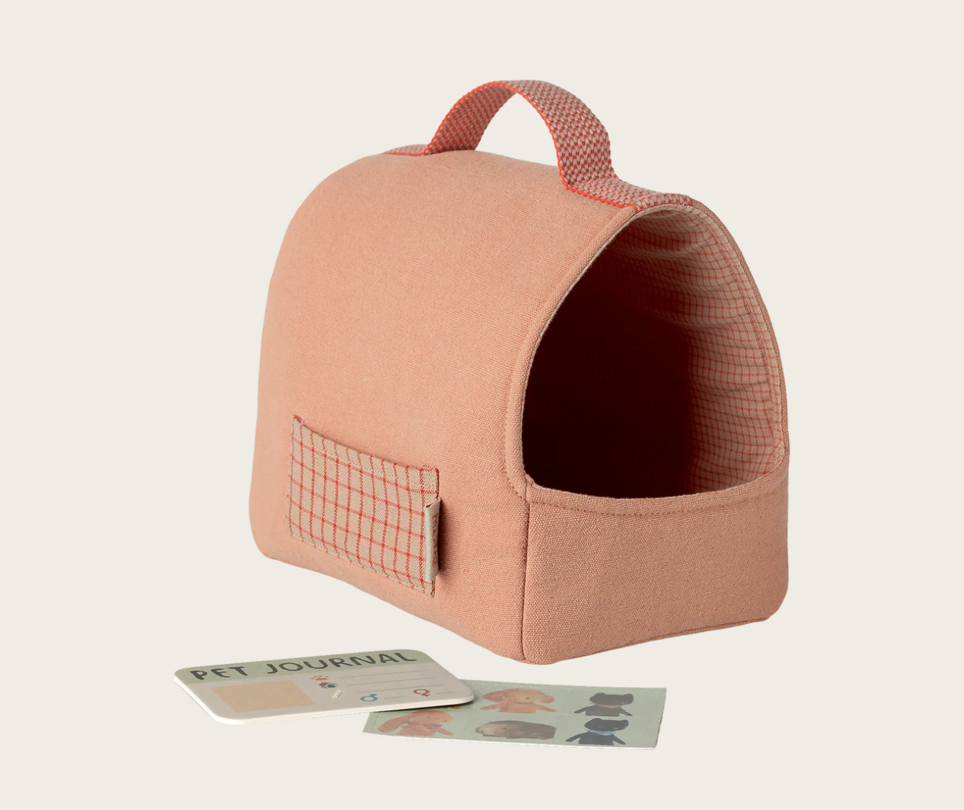 Denne skønne og bløde taske med håndtag er perfekt til de fine Maileg plyskillinger eller nye små hunde, eller andre små bamser selvfølgelig, der passer i størrelsen. Tasken er i en koral farve og har et super fint ternet mønster på lommerne. Her medfølger en kæledyrsjournal, så der kan holdes styr på billede, navn og fødselsdag. En dekorativ og praktisk tilføjelse til ethvert børneværelse.