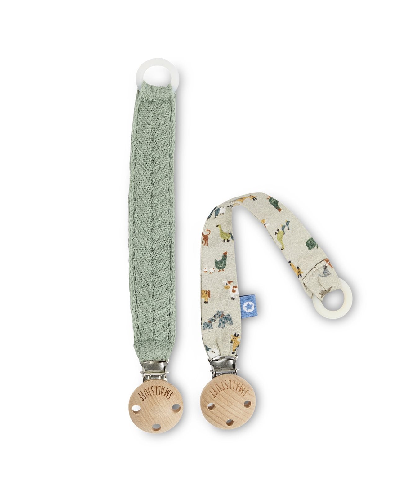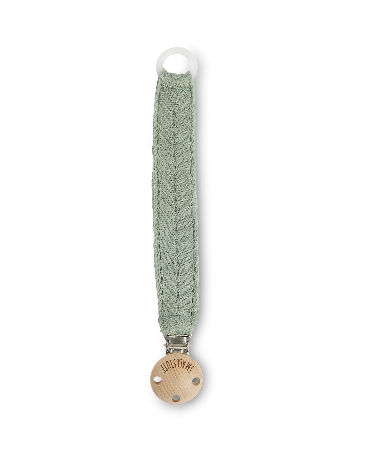 Smuk suttesnor med sildebensstrik i lys grøn farve, designet til at holde barnets sut sikkert fast, så den ikke bliver væk. Suttesnoren sættes fast med en metalklips på barnets tøj eller savlesmæk. Selve klipsen er monteret på en træknap. Selve sutten fastgøres på gummiringen.