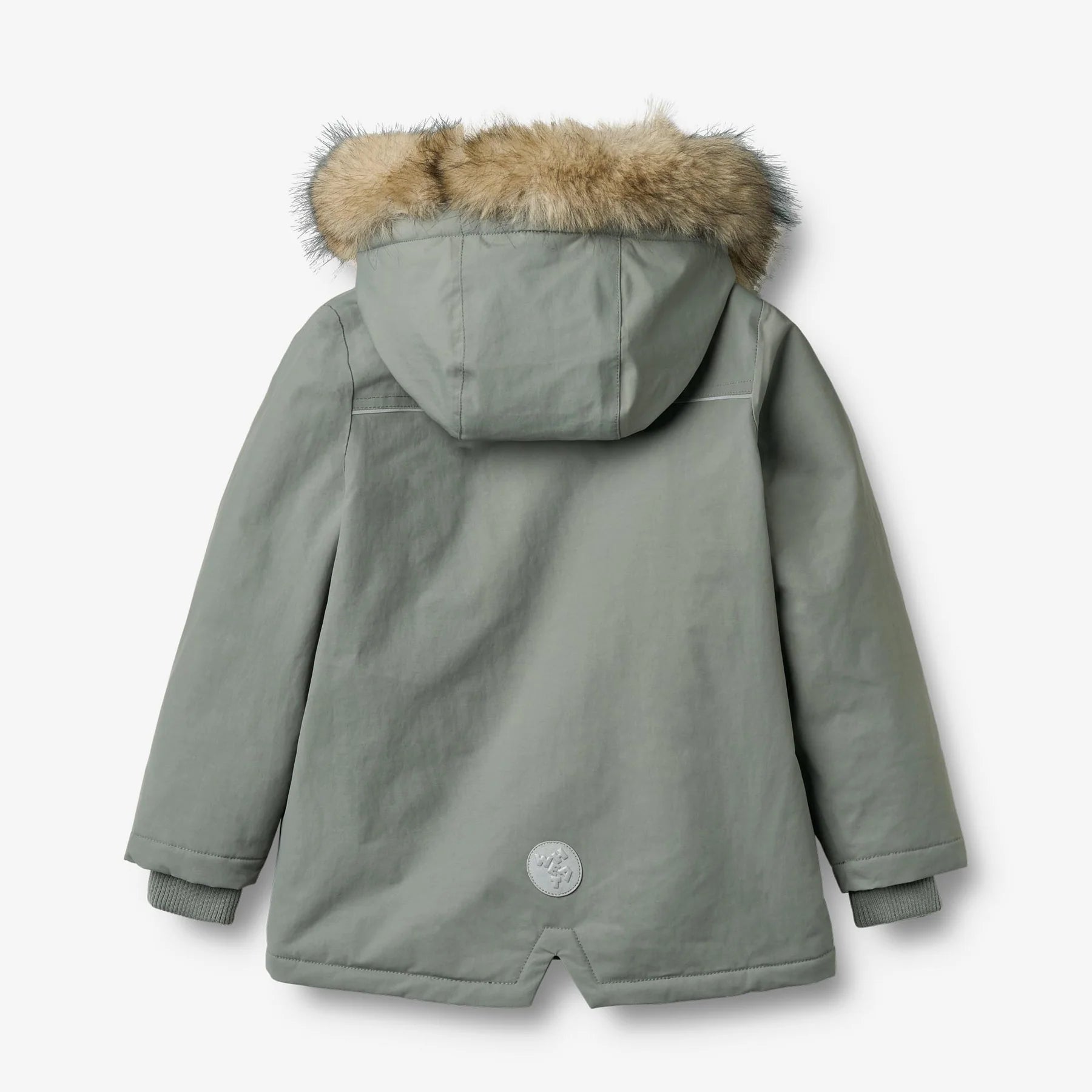 Foran lukkes jakken med en skjult YKK-lynlås og trykknapper under en beskyttende stolpe, hvor en hagebeskytter sikrer, at lynlåsen ikke generer huden. De praktiske sidelommer er udstyret med klap og lukkes nemt med velcro – ideelle til små skatte og kolde hænder.
