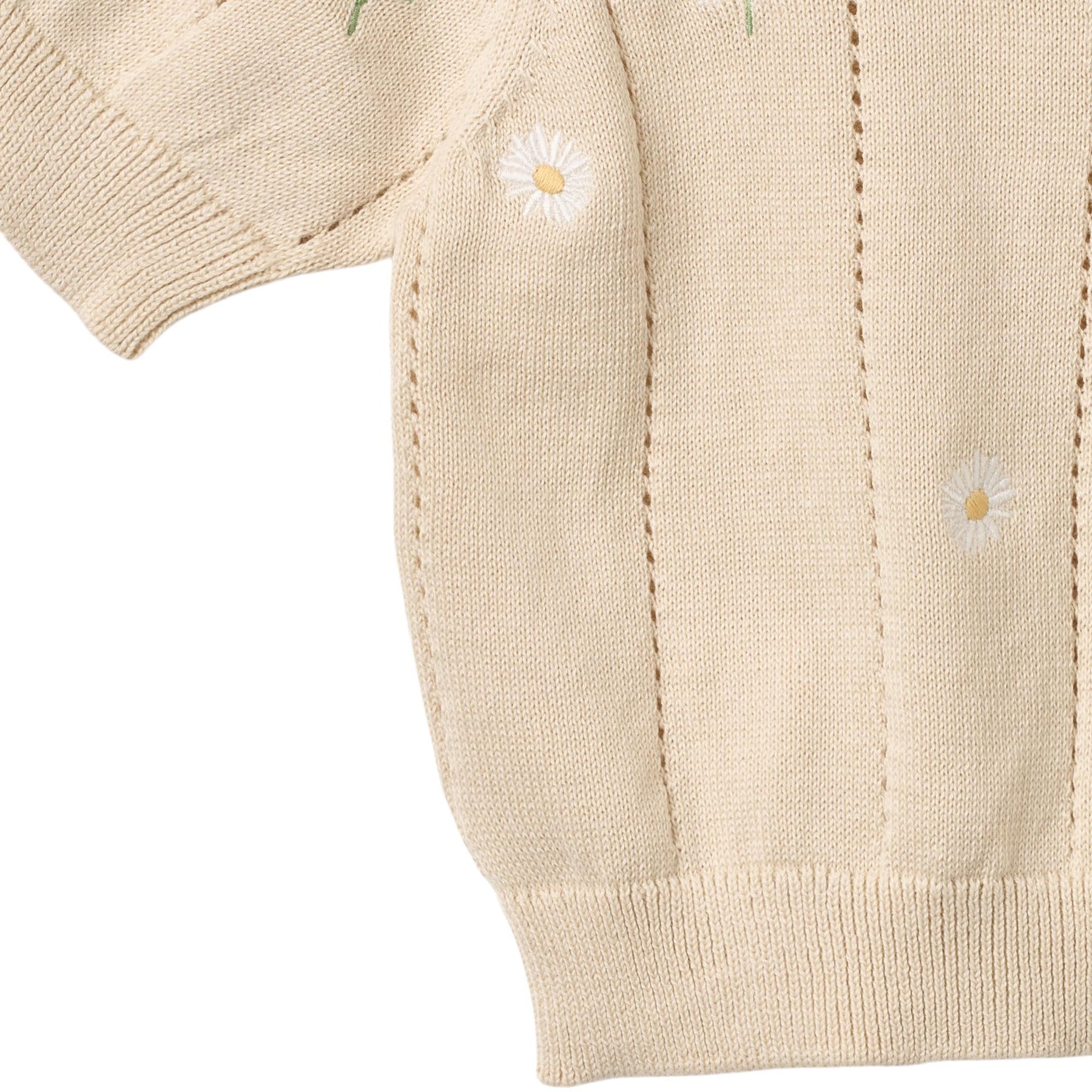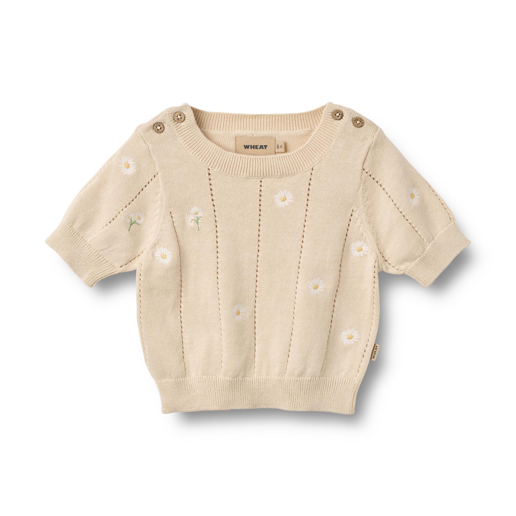 Strikket top i 100% økologisk bomuld fra danske Wheat. Toppen har en blød ribkant ved halsudskæringen, ærmerne og forneden. Den er designet med et sødt hulmønster samt blomster broderi. De praktiske knapper på skuldrene gør det nemt at klæde barnet på. Toppen er perfekt til de skiftende forårs- og sommermåneder, hvor dit barn har brug for let og åndbart tøj. Det bløde materiale føles behageligt mod huden og kradser ikke.