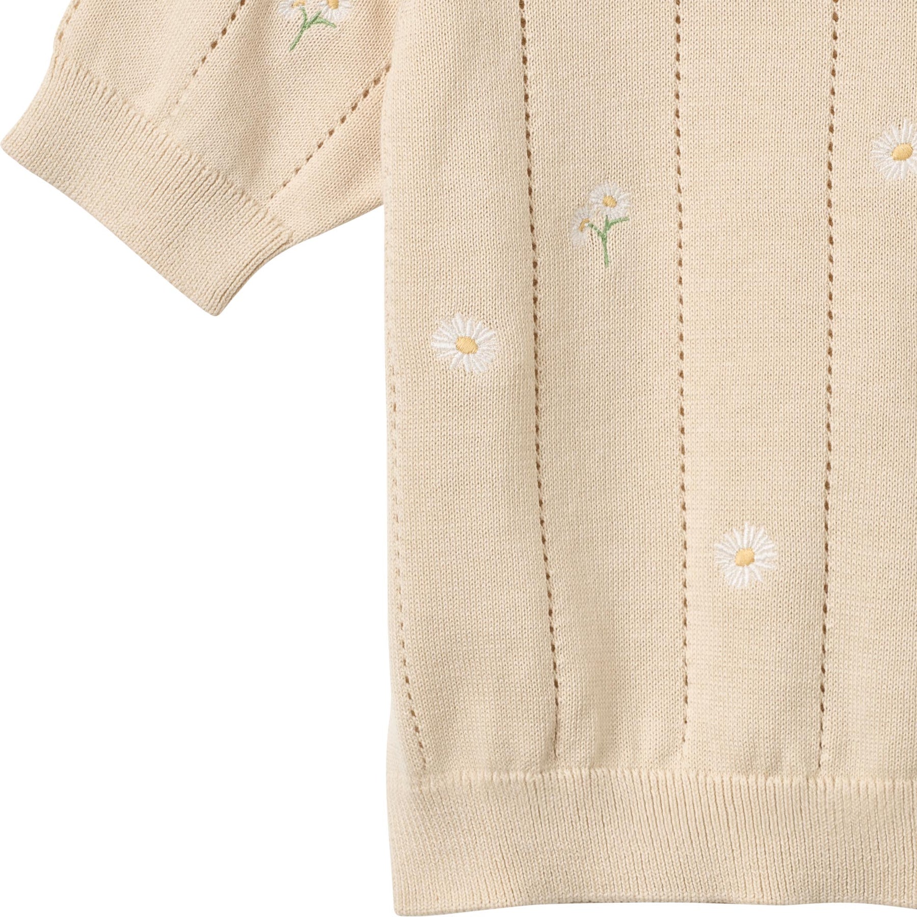 Strikket top i 100% økologisk bomuld fra danske Wheat. Toppen har en blød ribkant ved halsudskæringen, ærmerne og forneden. Den er designet med et sødt hulmønster samt fint blomster broderi. De praktiske knapper på skuldrene gør det nemt at klæde barnet på. Toppen er perfekt til de skiftende forårs- og sommermåneder, hvor dit barn har brug for let og åndbart tøj. Det bløde materiale føles behageligt mod huden og kradser ikke.