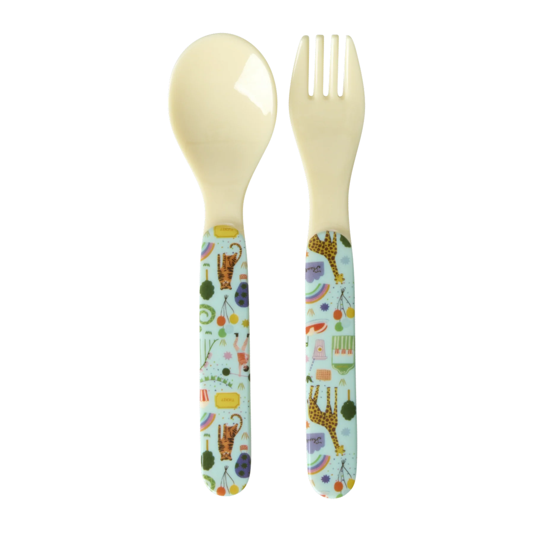 Farverigt og sødt børneservice fra Rice med Fun Fair print. Lad de små øve sig til spisetid med dette søde ske og gaffelsæt fra Rice.