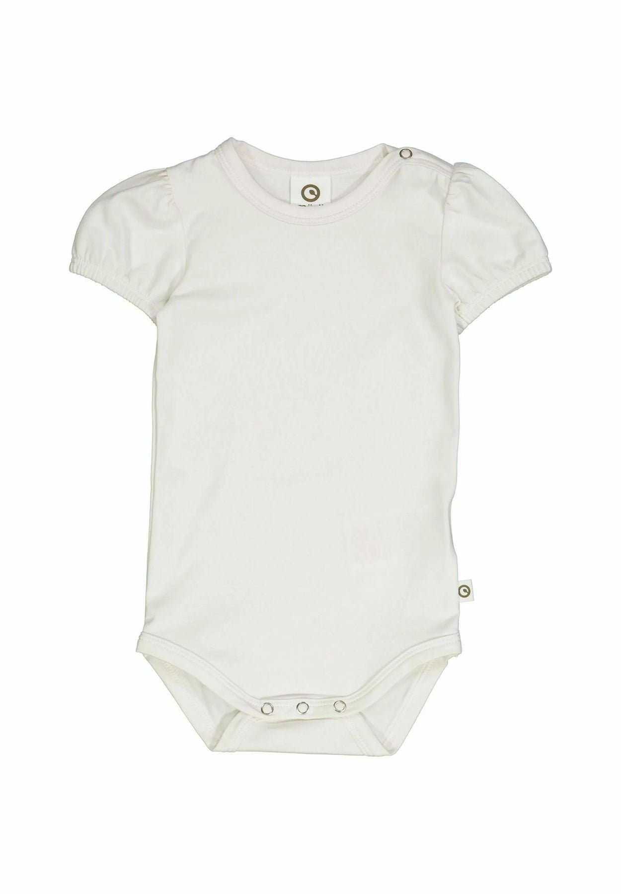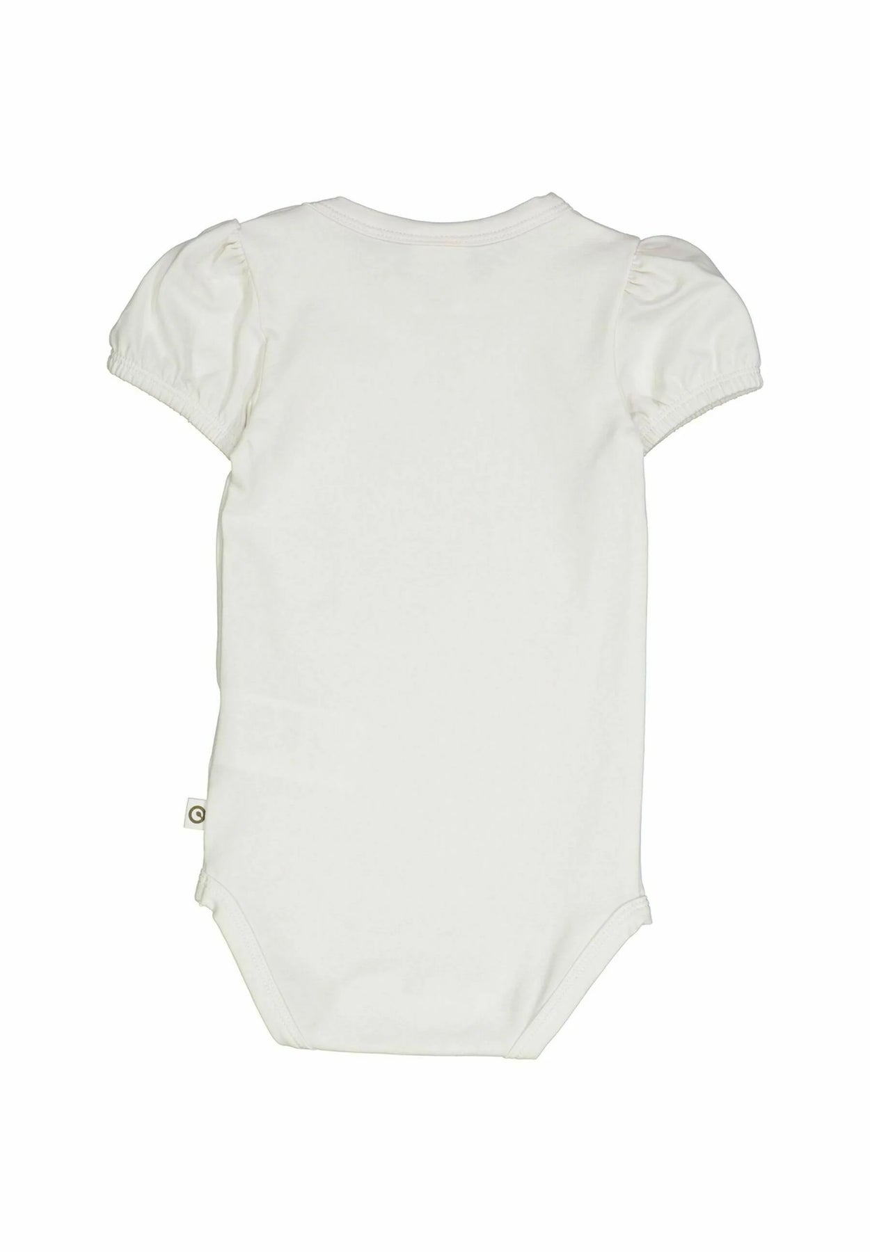 Denne søde bodystocking med korte puffærmer fra danske Müsli er i farven balsam cream. Bodystockingen lukkes mellem benene med tre trykknapper og en knap på skulderen.