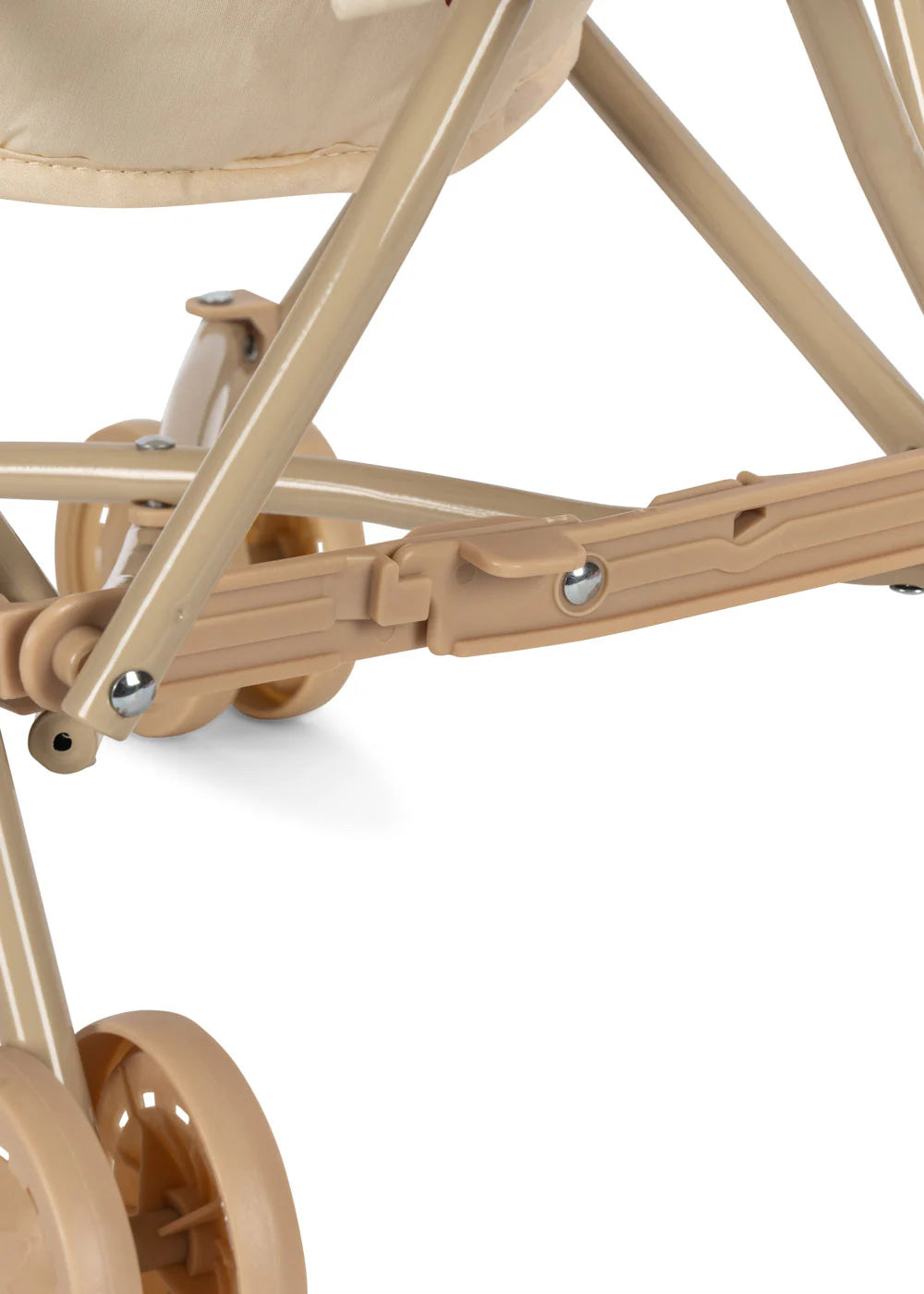 Klapvognen er designet i klassisk stil og udstyret med sele, bæretaske og dobbelthjul på alle fire ben for optimal stabilitet og sikkerhed under legen. Stoffet på vognen er aftageligt, hvilket gør den nem at holde ren.
